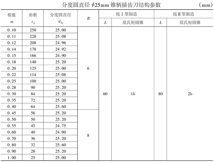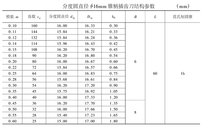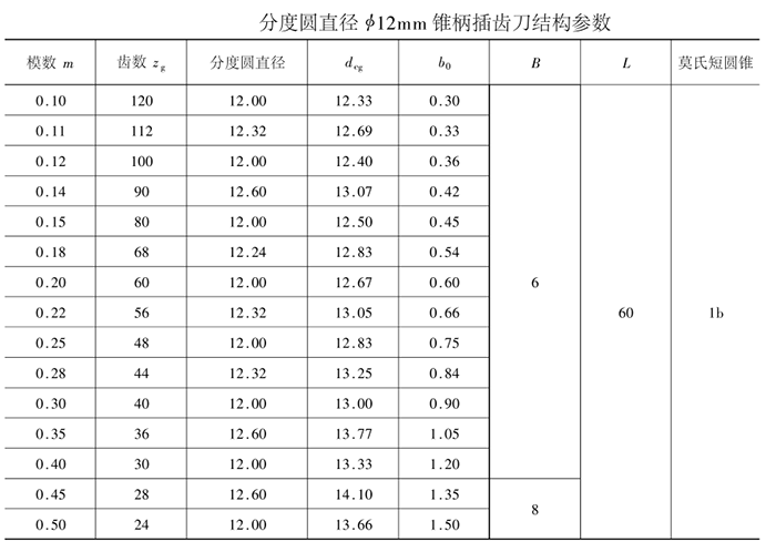 小模數(shù)齒輪錐柄插齒刀其公稱分度圓直徑有φ12、φ16和φ25三種。其主要結(jié)構(gòu)尺寸見表。